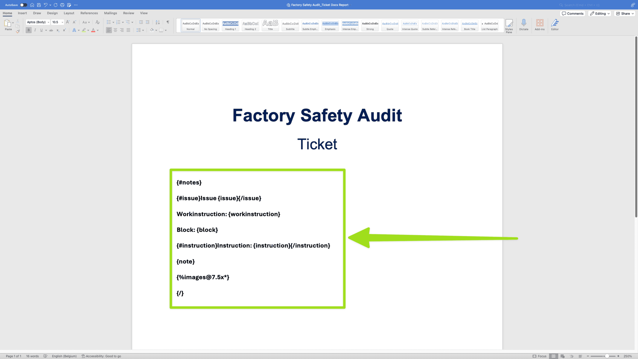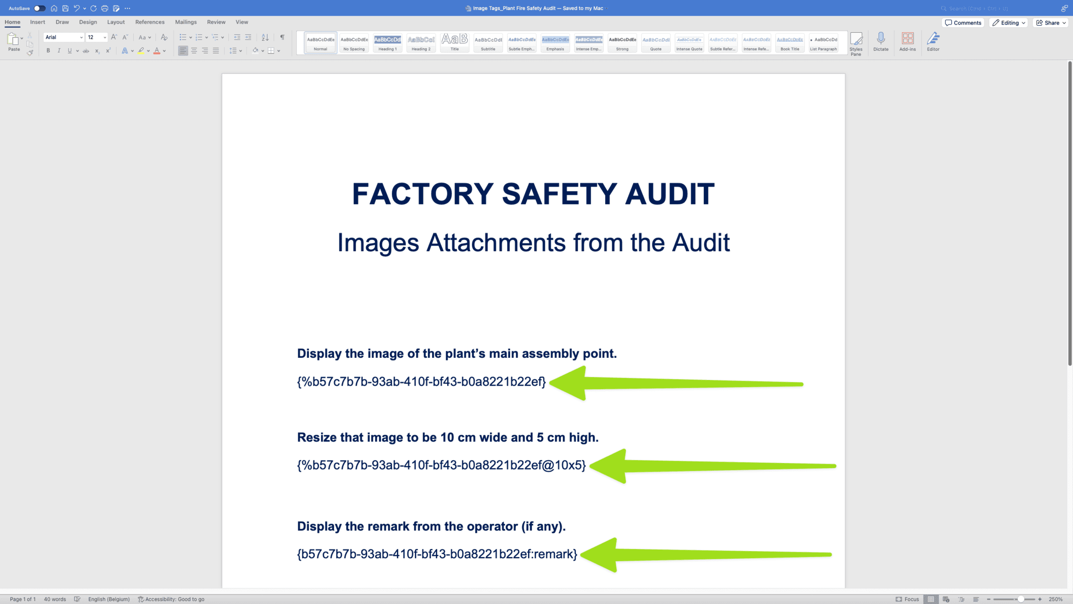 In the guide sections below, you can find the list of tags that can be used on audit docx reports: