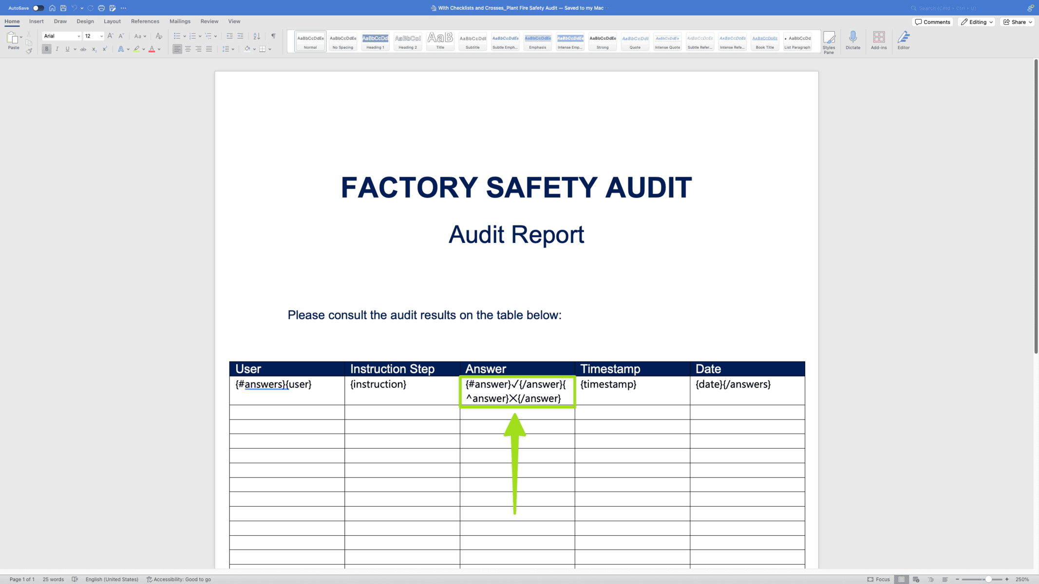 Besides text-based answers shown above, you can also use a checklist symbol to represent a positive answer and a cross symbol to represent a negative answer on your docx report. However, this functionality only works with the OK/NOK check and the Yes/No check.