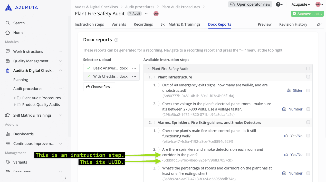 Besides using standard answer tags, you can also use Universally Unique IDentifiers (UUIDs) on a docx report. Using a UUID allows you to input data from any individual instruction step with a product check that you desire, in any order – into your docx report. This gives you much more flexibility than basic answer tags.