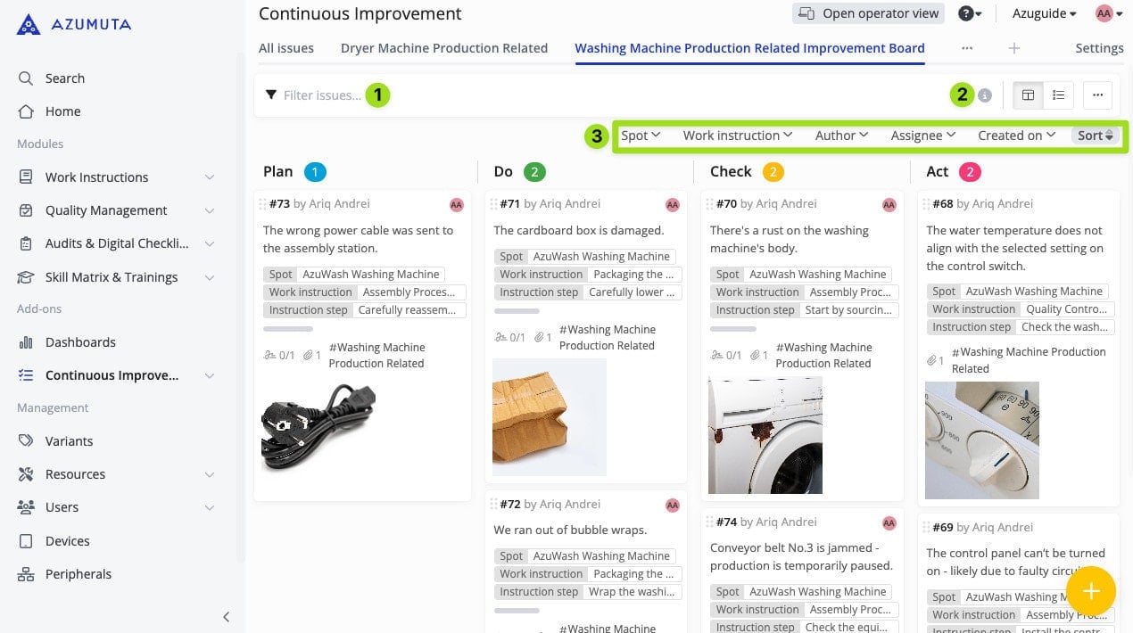 - Use this tool to filter out issues based on their properties. You can also click on “Sort” to sort out issues based on their creation date/deadline date/completion rate.