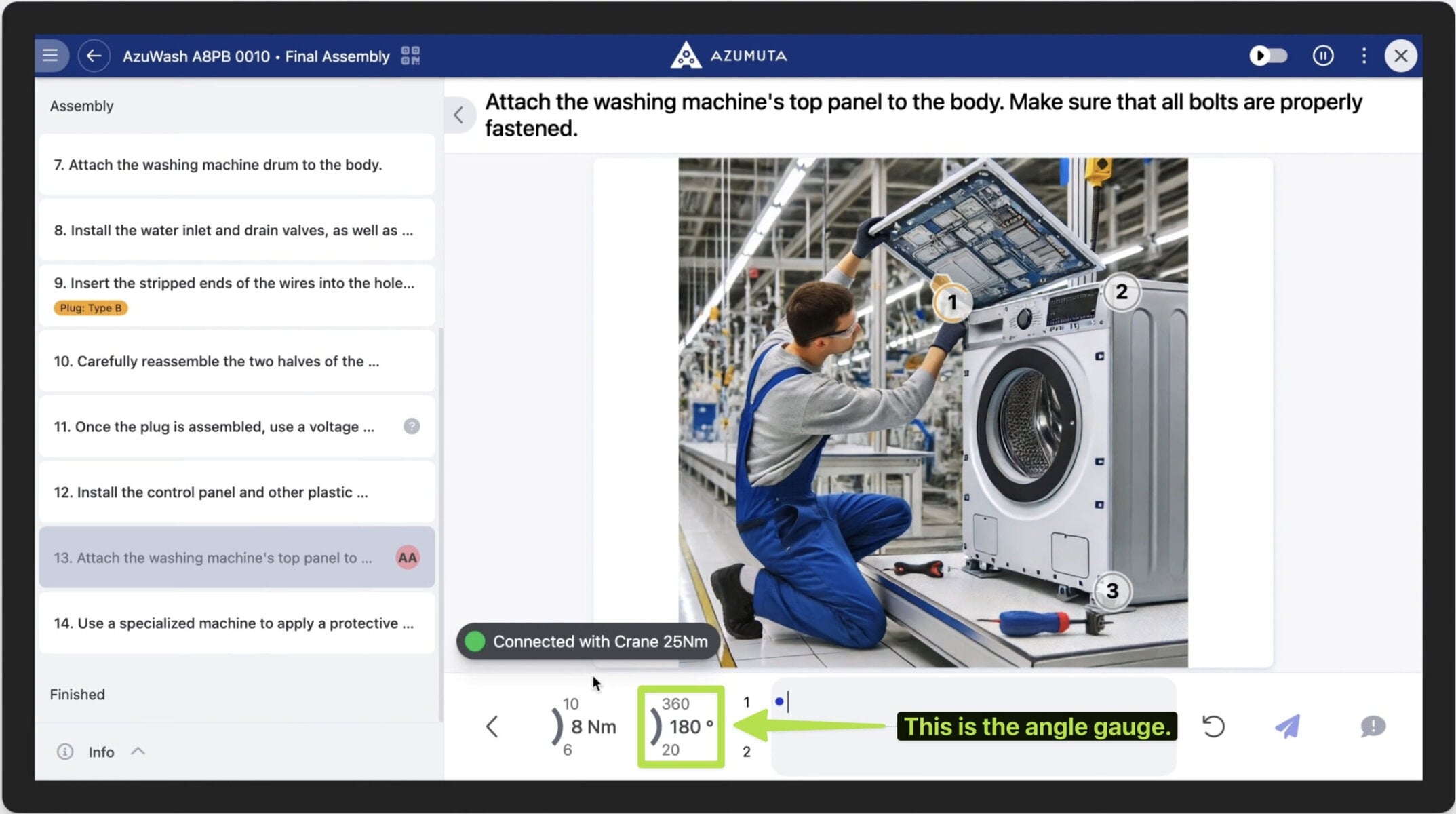 - Whether the operator that’s executing the torque check performs the correct torque angle (in real-time). If the torque angle that is performed is within the tolerated angle limits, then the gauge will turn green. However, if the torque angle that is performed is outside of the tolerated angle limits, then the gauge will turn red. That way, if the operator commits any mistake, they will be notified in real-time.