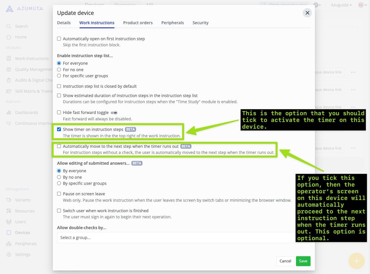- Optional: If you want the operator’s screen on this device to automatically proceed to the next instruction step when the timer runs out, then tick on “Automatically move to the next step when the timer runs out” as well.