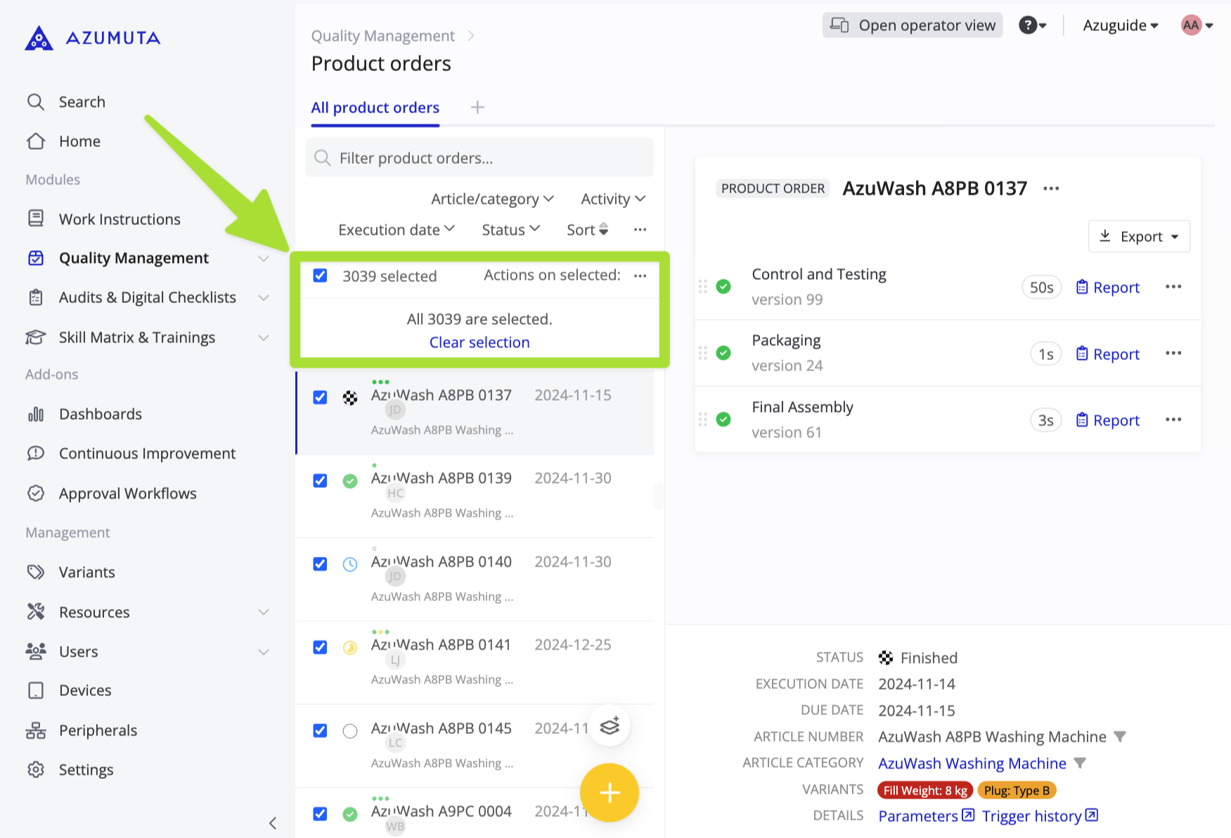 Now, you can select an unlimited number of product orders in your workspace, and do bulk actions towards them at once. Bulk actions that you can take include: