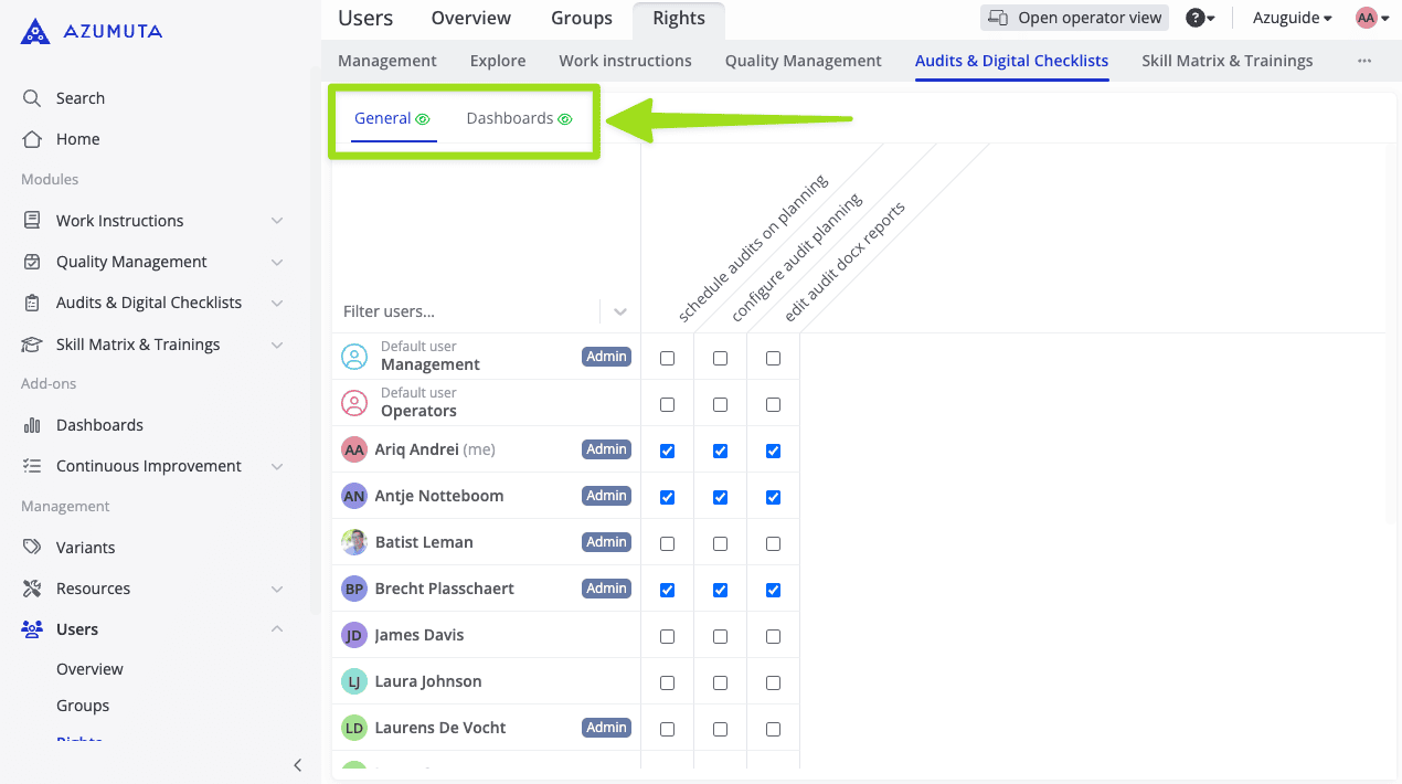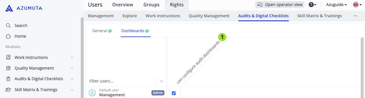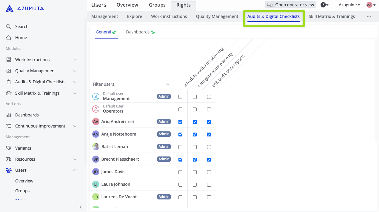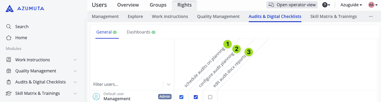 In this guide webpage, we will explain to you about the Audits & Digital Checklists tab. As the name suggests, this tab covers user rights that are related to the Audits & Digital Checklists module.