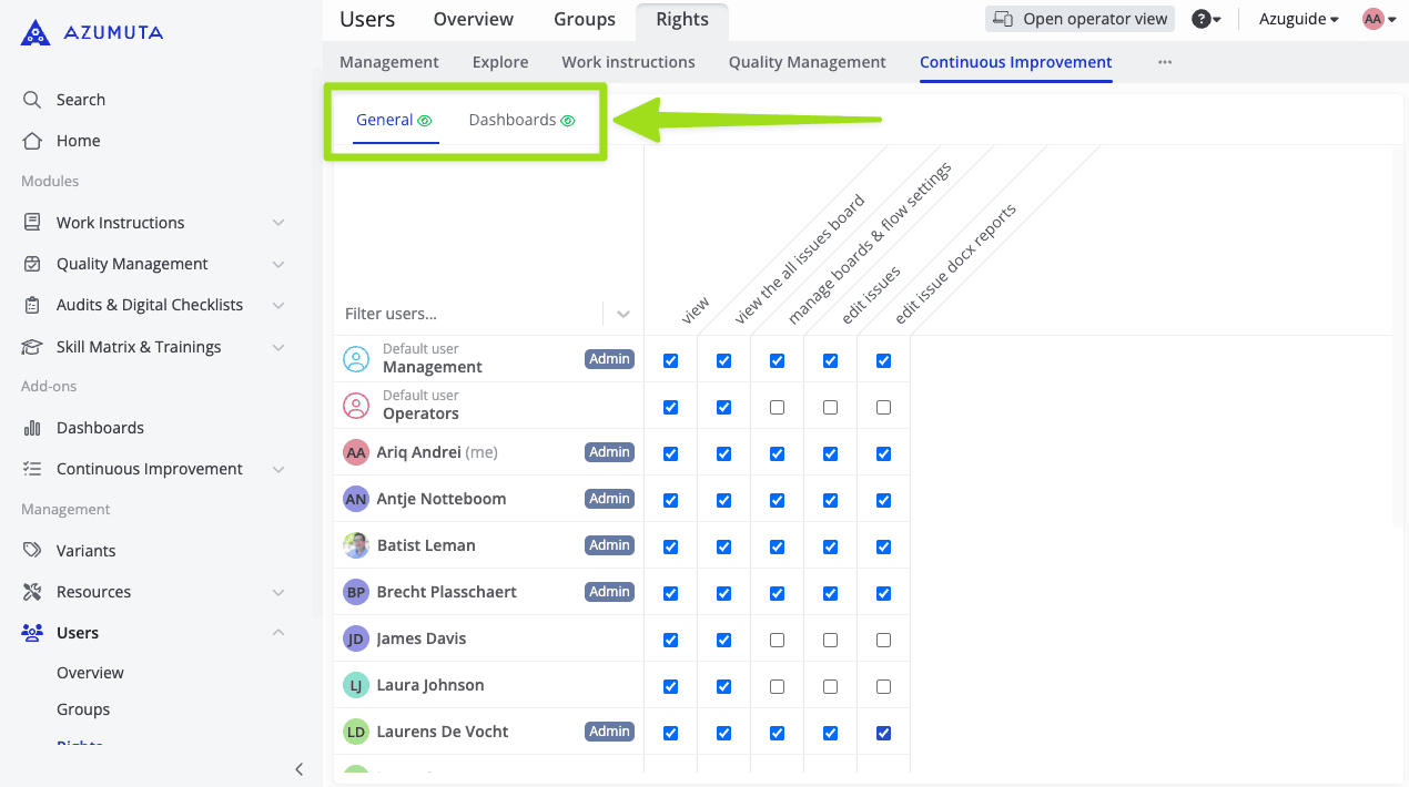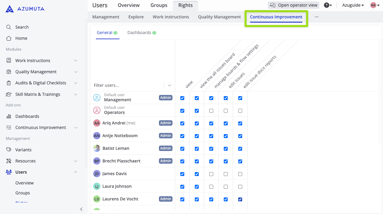 In this guide webpage, we will explain to you about the Continuous Improvement tab. As the name suggests, this tab covers user rights that are related to the Continuous Improvement add-on.