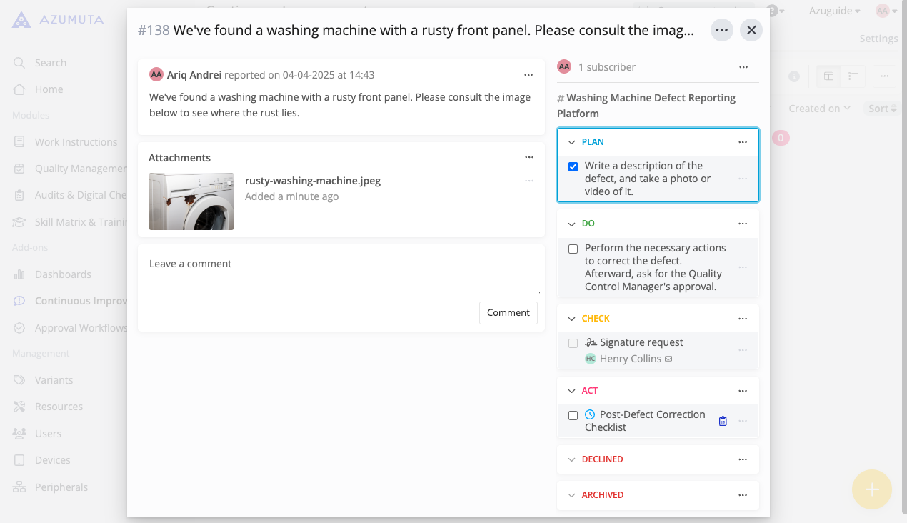 These attachments can help admins and operators alike to solve shop floor issues. Imagine a picture that pinpoints exactly where a product’s defect lies or a PDF file of a handbook that will help your operators troubleshoot a certain problem.