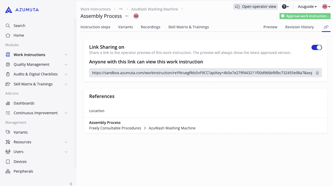And as expected, one of the advantages of using digital work instructions over paper-based ones is the ability to share and reproduce them infinitely. You can export & import them within the platform and across multiple Azumuta workspaces, print them, and even share them publicly with non-Azumuta users.