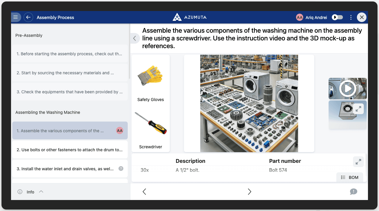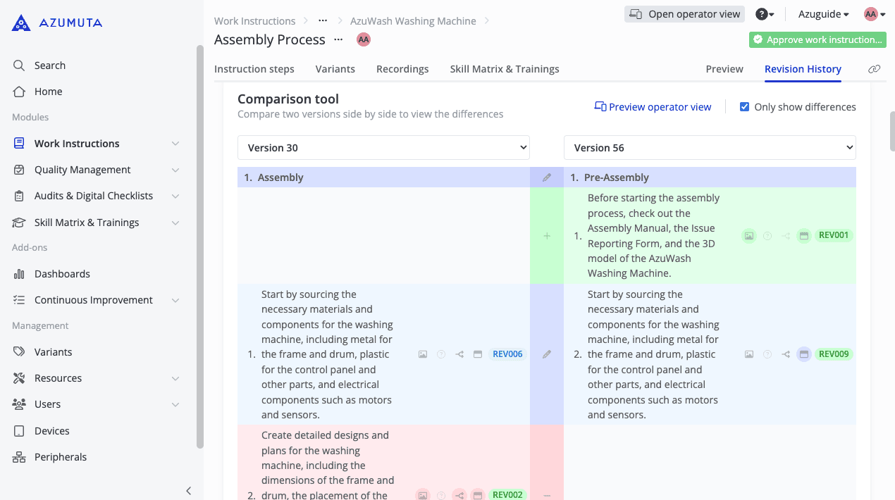 Azumuta’s Freely Consultable Work Instructions module is a comprehensive digital solution designed to optimize the creation, management, and sharing of manufacturing work instructions.