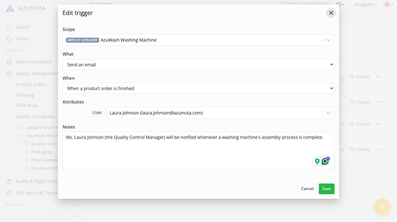 For example, wouldn’t it be great if you’re automatically notified whenever an operator finishes a product order? Or that an audit will be automatically scheduled whenever a certain production phase in your plant doesn’t fulfill your standards and must be reworked on?