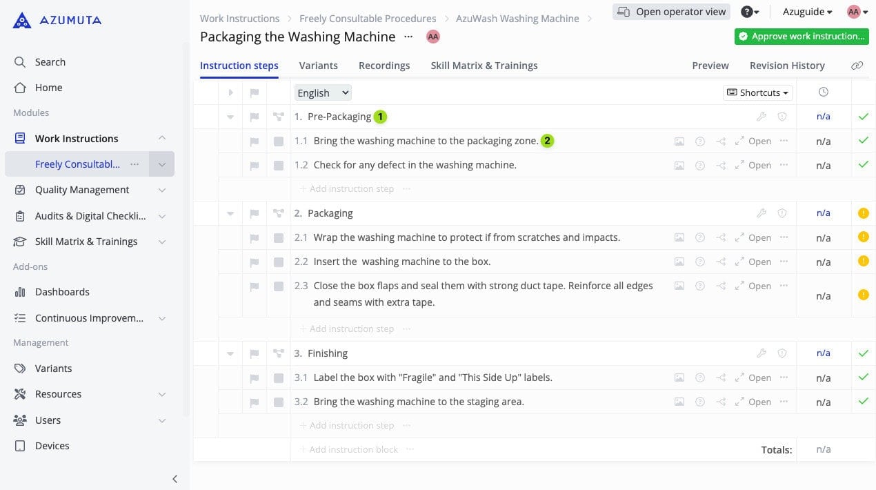 Just as the name suggests, a work instruction is a platform that is used by an admin to give instructions to an operator for executing a certain task on the shop floor. Moreover, in Azumuta, an instruction step within a work instruction can also be equipped with countless supporting features, such as visual elements, product checks, attachments, and many more.