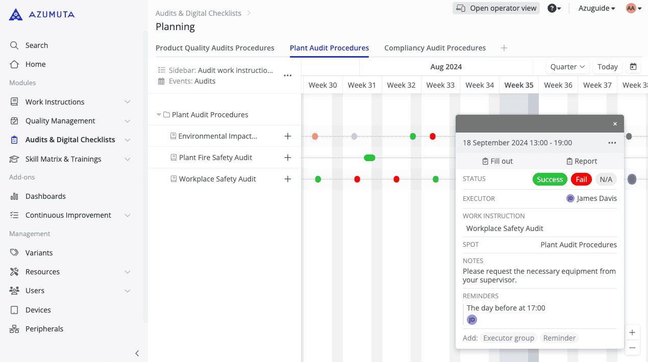 Azumuta’s Audits & Digital Checklist module is designed to streamline any audit within manufacturing environments. This module allows you to digitize and standardize your audit procedures, making it easier for your plant to maintain its consistency and compliance. Be it for regular maintenance audits or for external audits (such as the ISO audits) – our module is ready to help you run & manage any audit in your plant.