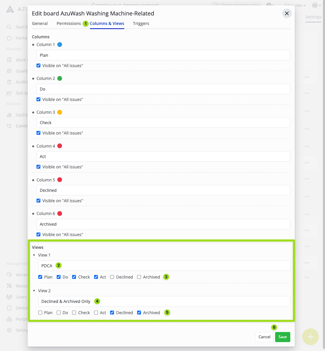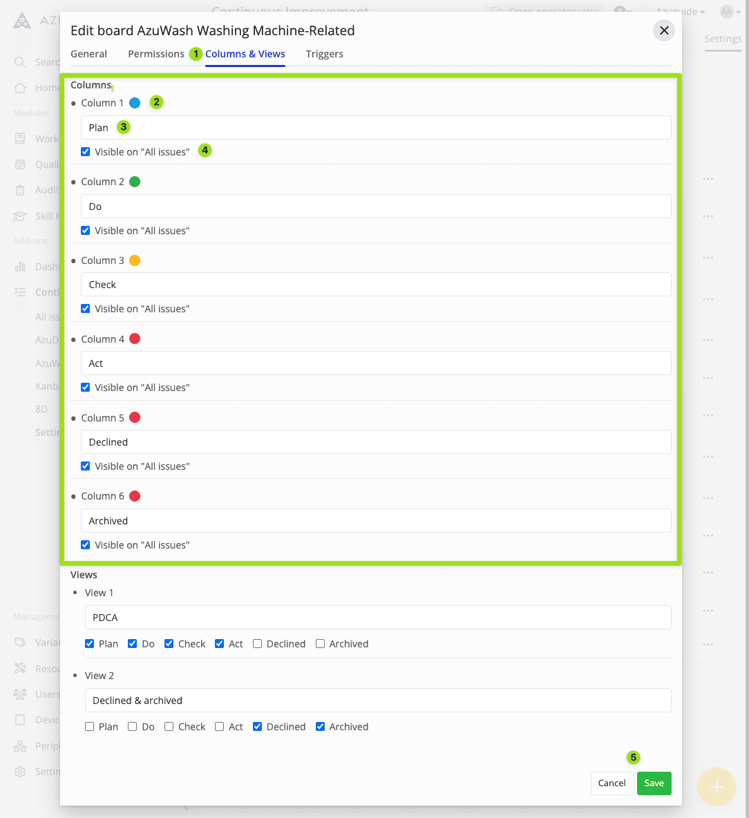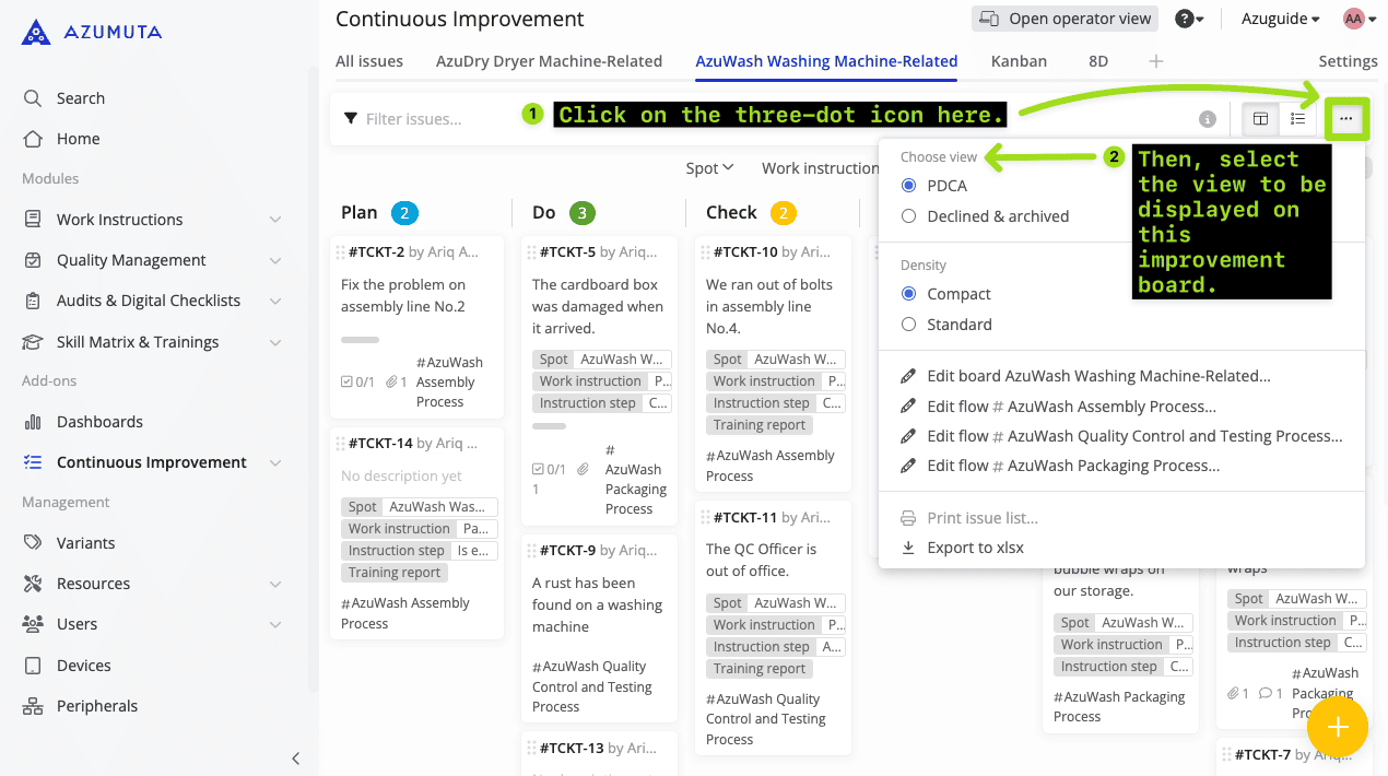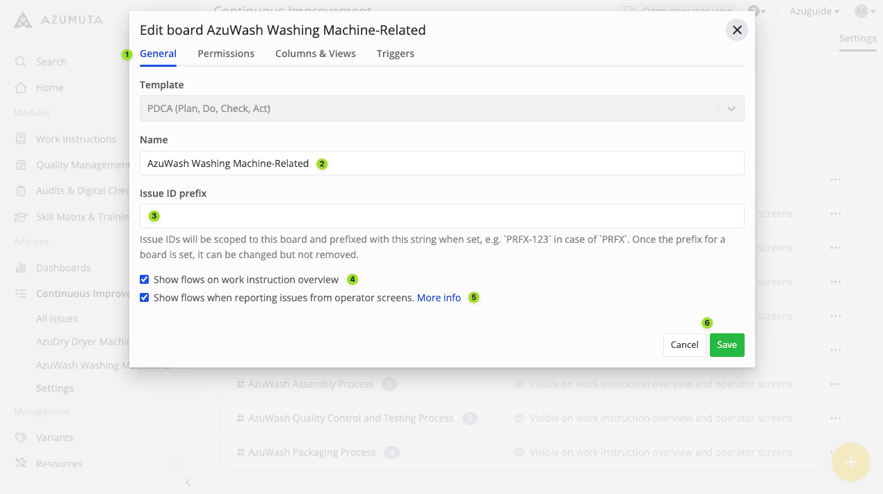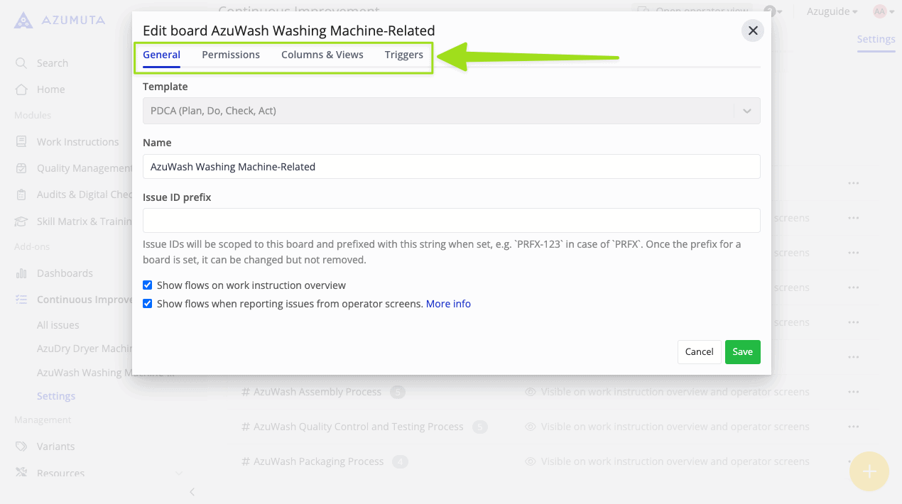 Remarque : il existe actuellement 3 modèles de tableaux d'amélioration et de flux d'amélioration : PDCA, Kanban et 8D. Ces trois modèles partagent les mêmes paramètres d'édition. Dans cette page web, nous utiliserons le modèle PDCA dans nos exemples.