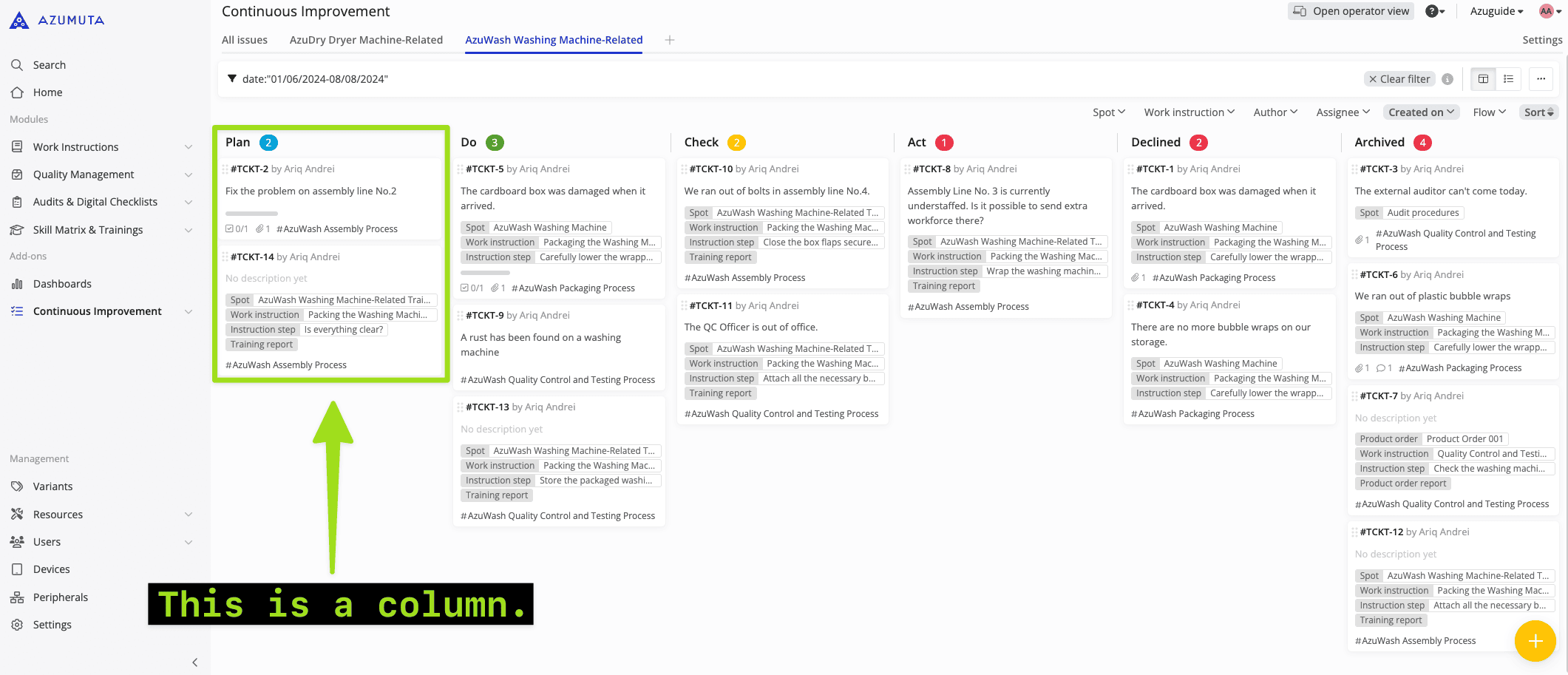 Dans un tableau d'amélioration, une colonne représente le statut d'un ticket, comme la colonne "Plan" montrée sur la capture d'écran d'un tableau d'amélioration ci-dessous. Sur ce tableau d'amélioration, il y a 6 colonnes au total (les colonnes Plan, Faire, Vérifier, Agir, Refusé et Archivé).