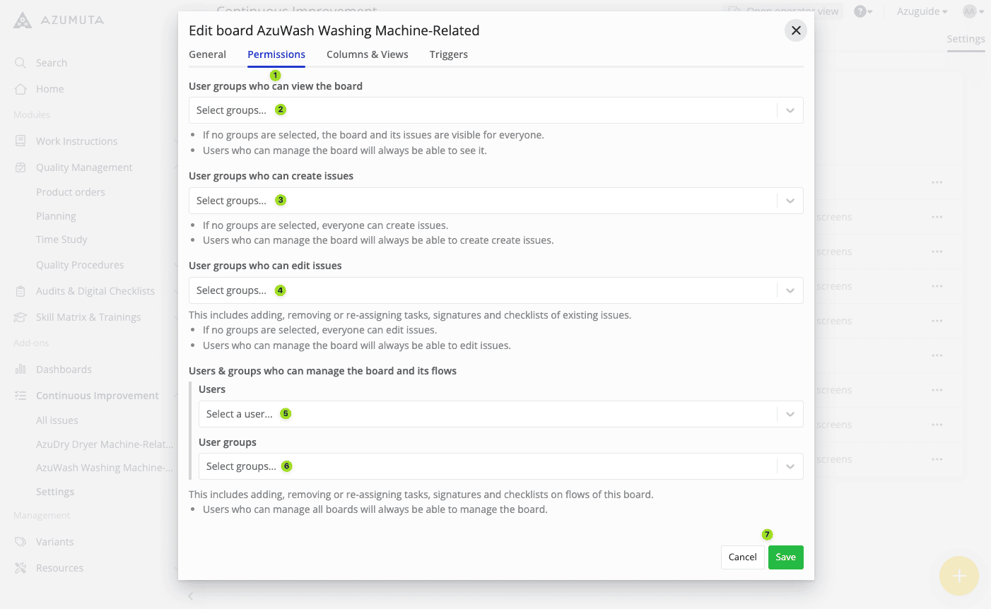 - Sélectionnez le(s) groupe(s) d'utilisateurs autorisé(s) à gérer ce tableau d'amélioration et tous les flux d'amélioration qui en font partie.