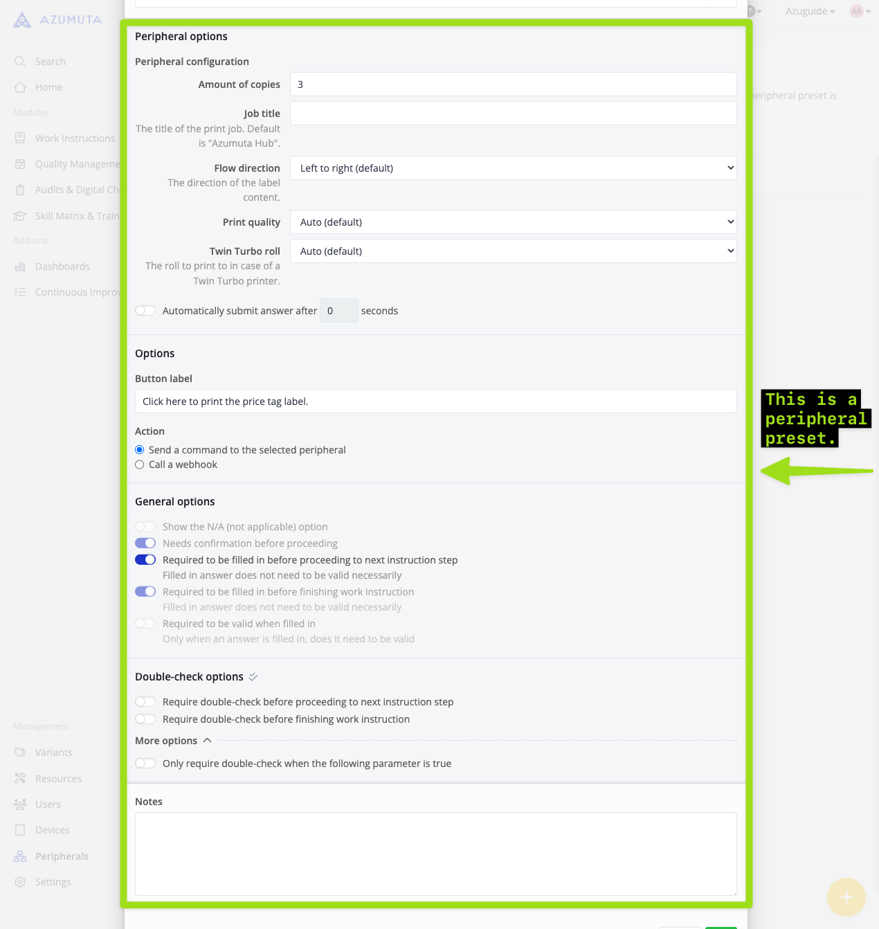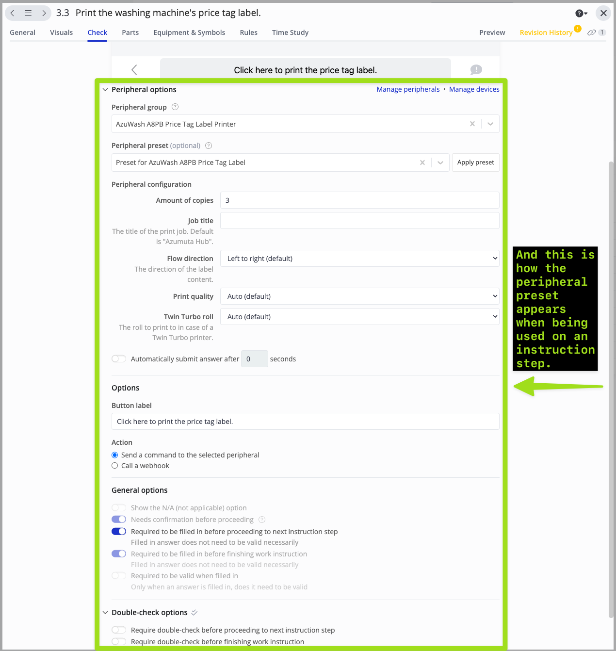 - Tous les champs sous "Options périphériques" sont les mêmes que ceux de n'importe quel contrôle de procédure. Cliquez ici pour en savoir plus sur les options de configuration d'un contrôle de procédure pour l'impression d'étiquettes.